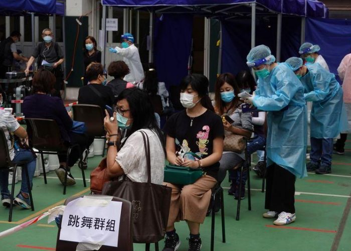 FILE PHOTO: Medical workers in protective suits attend to people at a makeshift community testing centre for the coronavirus disease (COVID-19), in Hong Kong’s Yau Tsim Mong district, China November 24, 2020. REUTERS/Joyce Zhou