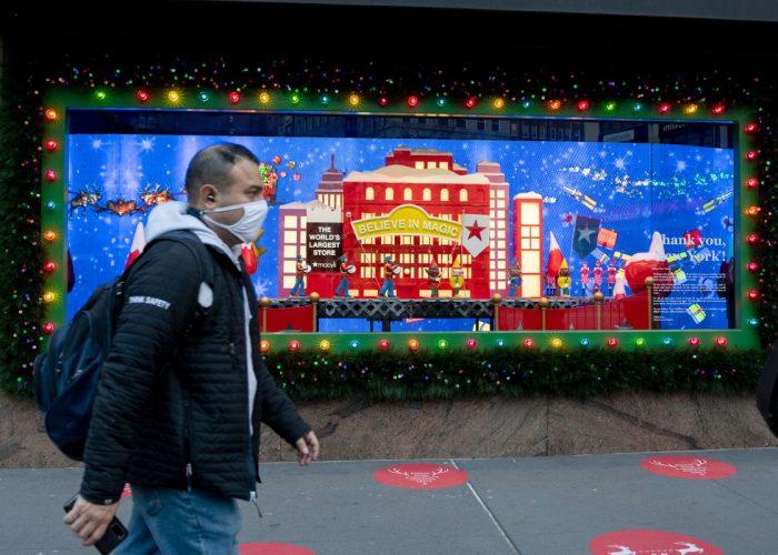 NEW YORK, NEW YORK – NOVEMBER 20: People wearing masks walk past the newly opened holiday windows at … [+] Macy’s Herald Square on November 20, 2020 in New York City. The pandemic has caused long-term repercussions throughout the tourism and entertainment industries, including temporary and permanent closures of historic and iconic venues, costing the city and businesses billions in revenue. (Photo by Alexi Rosenfeld/Getty Images)