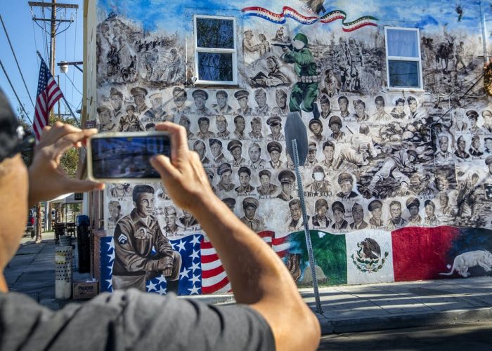 A mural outside La Chiquita Grocery in Santa Ana, Calif. honors the military service of nearly 200 local Mexican Americans. Allen J. Schaben/Los Angeles Times via Getty Images
