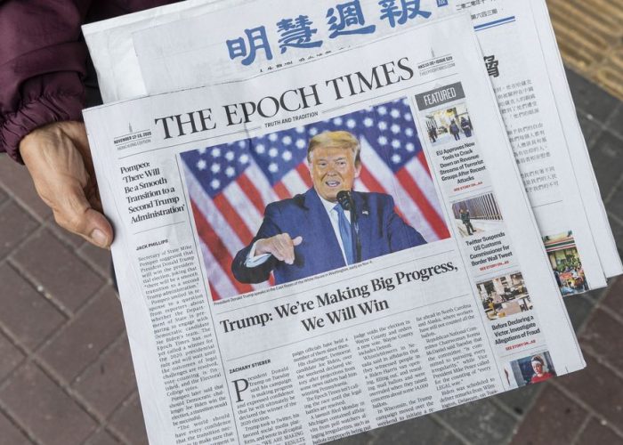 A copy of the Epoch Times, a free newspaper backed by the Chinese spiritual movement Falun Gong that tends to espouse anti-communist, pro-Trump views. | Miguel Candela via Getty Images