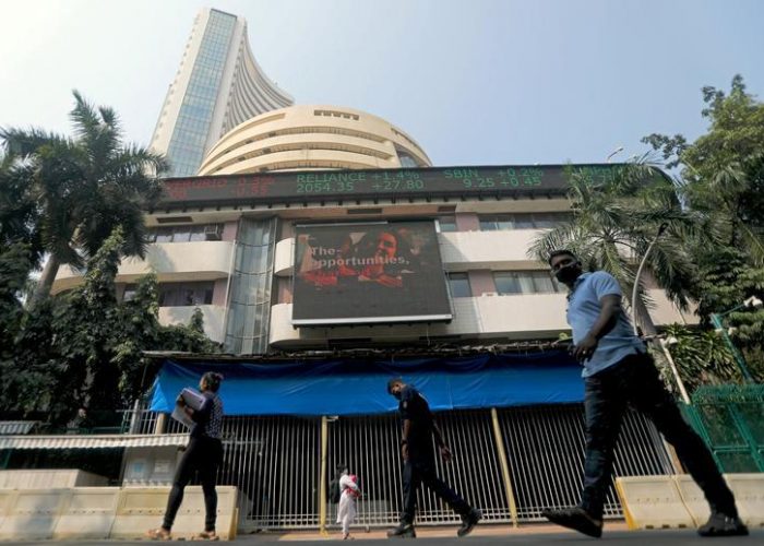 FILE PHOTO: People walk past the Bombay Stock Exchange (BSE) building in Mumbai, India, November 4, 2020. REUTERS/Francis Mascarenhas/File photo