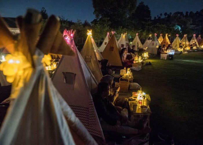 BANDUNG, Indonesia (Reuters) – Perched on a hilltop overlooking the Indonesian city of Bandung neat lines of teepee-style tents are set up each evening on a patch of lawn in front of a large screen.