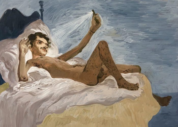 Technology is woven seamlessly throughout Toors work, smartphones cradled in the palms of partygoers and laptops balanced precariously on side tables are a constant reminder of the secondary, digital lives these subjects lead. In Bedroom Boy (2019), a reference to Manets Olympia, a nude man, sprawled across a white bedspread, gazes into the camera of his phone, lofted high to catch the right angle. Beyond centering the brown, queer body, Toors rendition of the reclining nude toys with embedded notions of power and privilege, recasting technology as a tool for returning erotic agency to the subject.