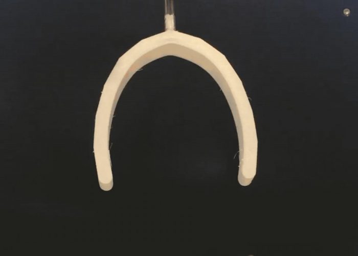 What can you do with hierarchical multistability? As a demonstration, Arrieta’s team built a simple robotic gripper, using two lines of domes. When the domes were concave, the gripper arms stayed open. But by applying a small amount of air pressure to actuate the domes to become convex, the gripper arms closed tight enough to grasp and hold a small weight.