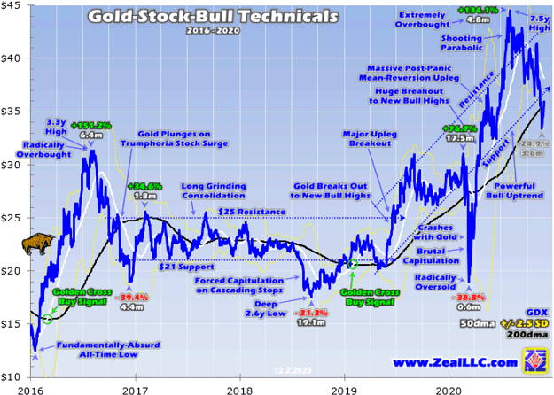 Context and perspective are essential for understanding and trading markets, so this chart shows GDX’s price action over gold stocks’ entire secular bull market. Overall between mid-January 2016 and early-August 2020, the major gold stocks soared 256.7% higher during this 4.5-year span. That leveraged gold’s own parallel bull run by 2.9x, on the high side of major gold stocks’ normal range running from 2x to 3x.