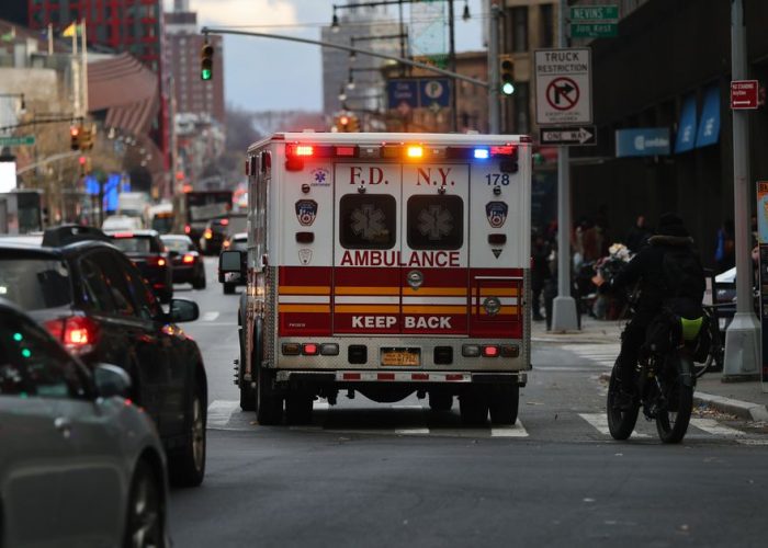 An ambulance drives down a road in Brooklyn on December 1st, 2020, in New York City.
