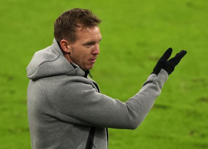 FILE PHOTO: Soccer Football – Bundesliga – Bayern Munich v RB Leipzig – Allianz Arena, Munich, Germany – December 5, 2020 RB Leipzig coach Julian Nagelsmann reacts Pool via REUTERS/Alexander Hassenstein DFL regulations prohibit any use of photographs as image sequences and/or quasi-video./File Photo