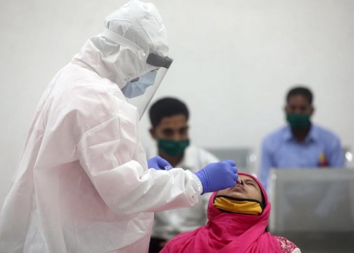 A health worker in a personal protective equipment (PPE) collects a swab sample from a woman amidst the spread of the coronavirus disease (COVID-19) in Mumbai, December 1, 2020. REUTERS/Francis Mascarenhas