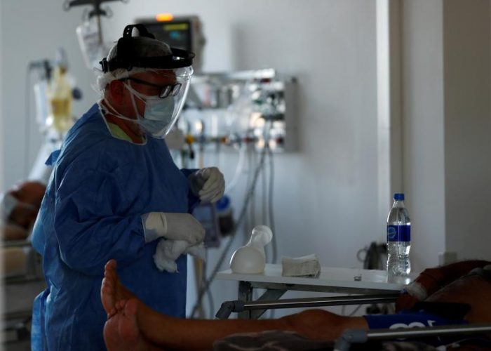 FILE PHOTO: Nurse David Rosas checks a patient suffering from the coronavirus disease (COVID-19) in an intensive care unit of a hospital, on the outskirts of Buenos Aires, Argentina October 16, 2020. REUTERS/Agustin Marcarian