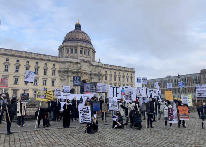 A protest against the Humboldt Forum in July of 2020 (courtesy the Coalition of Cultural Workers Against Humboldt)