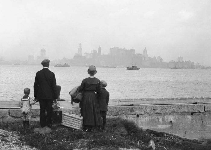 An immigrant family on the dock at Ellis Island, 1925. (Photo by Bettmann / Getty)