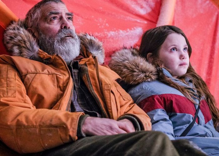 Meanwhile, Augustine a highly reputable space scientist has stuck around in a remote arctic outpost where the air is still relatively safe. He’s there to maintain contact with ongoing deep space missions that haven’t come back yet and is primed for a solitary post-apocalypse until he discovers a preteen stowaway named Iris (Caoilinn Springall).