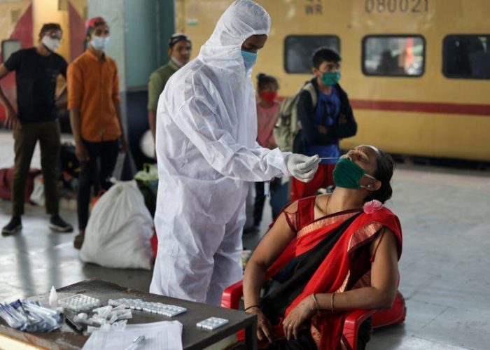FILE PHOTO: A health worker in personal protective equipment (PPE) collects a swab sample from a woman during a rapid antigen testing campaign for the coronavirus disease (COVID-19), at a railway station platform in Mumbai, India, December 19, 2020. REUTERS/Francis Mascarenhas/File photo