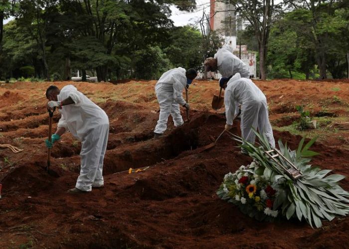 FILE PHOTO: Gravediggers wearing protective suits bury the coffin of a man who died from the coronavirus disease (COVID-19), during Christmas Day at Vila Formosa cemetery, Brazil’s biggest cemetery, in Sao Paulo, Brazil, December 25, 2020. REUTERS/Amanda Perobelli