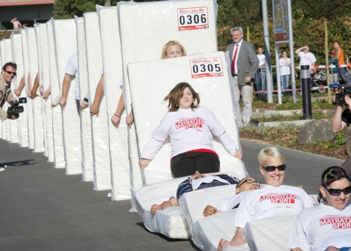 There have been anecdotal tales of human mattress dominoes on U.S. college campuses. Yet the clearest origin of human mattress dominoes as a competitive global sport was you may have guessed it a promotional stunt for a mattress supplier.
