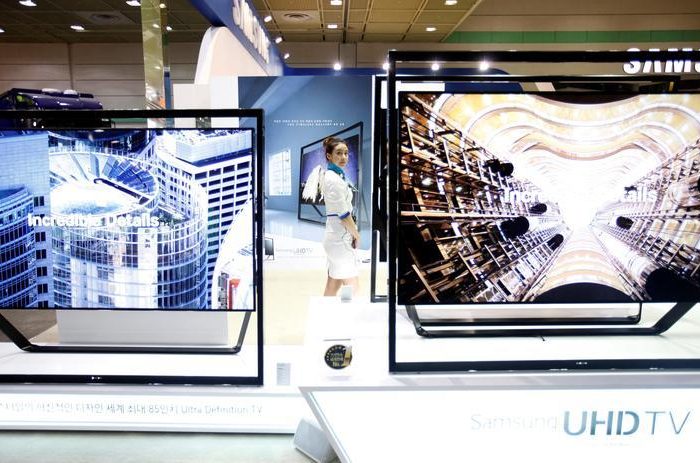 FILE PHOTO: A model stands between Samsung Electronics’ Ultra HD LCD televisions during World IT show 2013 at the Coex convention centre in Seoul May 22, 2013. World IT Show (WIS) 2013, Korea’s largest IT trade show. REUTERS/Kim Hong-Ji /File Photo