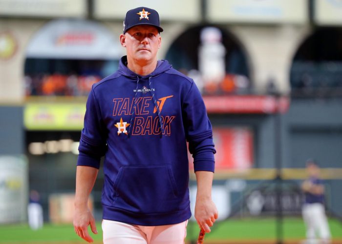 HOUSTON, TX – OCTOBER 29: Manager AJ Hinch #14 of the Houston Astros looks on during batting … [+] practice prior to Game 6 of the 2019 World Series between the Washington Nationals and the Houston Astros at Minute Maid Park on Tuesday, October 29, 2019 in Houston, Texas. (Photo by Alex Trautwig/MLB Photos via Getty Images)