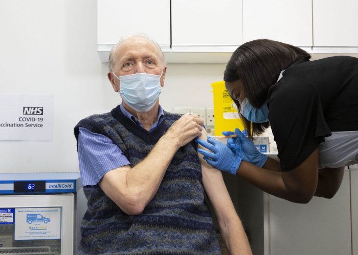 Pharmacist Andrew Hudson (left) speaks to Robert Salt (centre), 82, before he receives the coronavirus vaccine in Macclesfield, Cheshire. Credit: PA