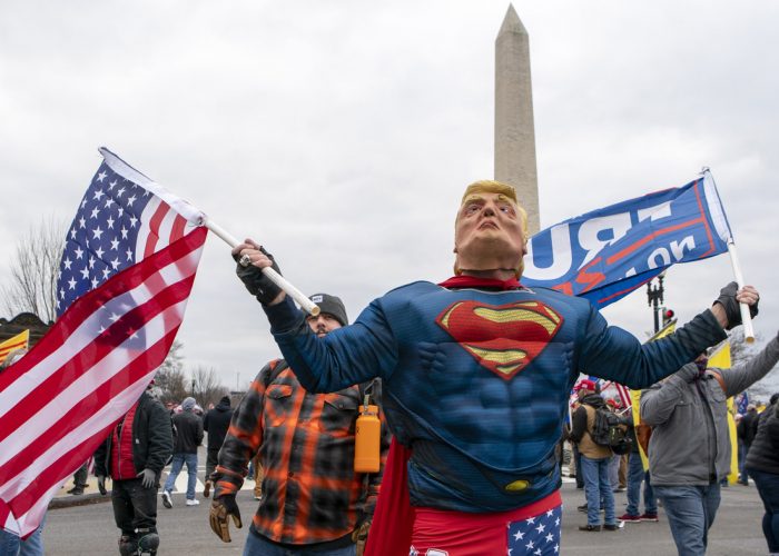 A Trump supporter dressed as the president in a Superman outfit attends the Jan. 6 rally against the election results before rioters stormed the U.S. Capitol.