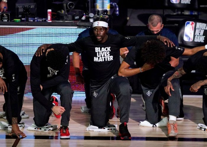 Former Pelican Jrue Holiday kneels with teammates prior to New Orleans’ game against the Kings in early August. Throughout the NBA restart, Holiday donated his game checks to Black-owned businesses and initiatives. Ashley Landis/Pool Photo/USA TODAY Sports