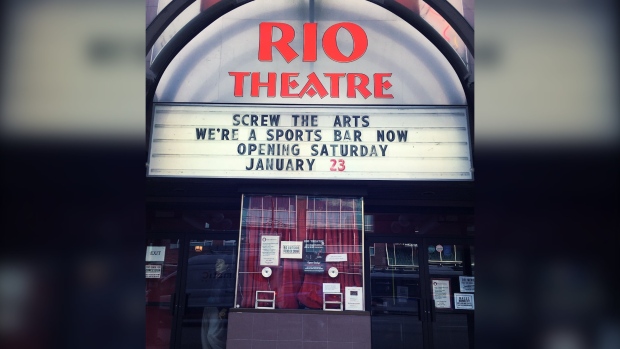 A post on Twitter shows a photo of the theatres sign saying, Screw the arts, were a sports bar now. Reopening Saturday, Jan. 23.