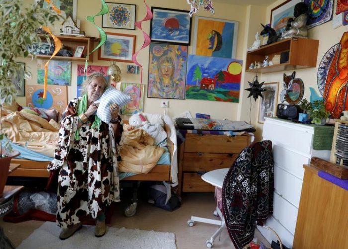 Margit Hechler, an inhabitant of a Berlin nursing home in which residents speak about their experience dealing with the coronavirus (COVID-19) lockdown, death and vaccination, sits on her bed, in Berlin, Germany July 11, 2020. REUTERS/Alessia Cocca