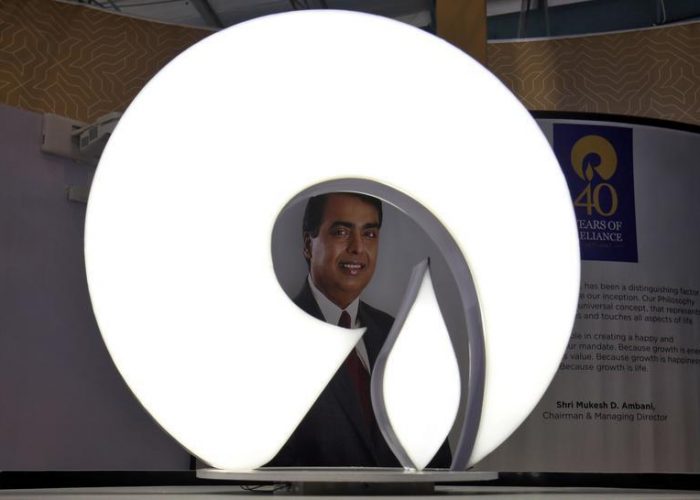 The logo of Reliance Industries is pictured in a stall at the Vibrant Gujarat Global Trade Show at Gandhinagar, India, January 17, 2019. REUTERS/Amit Dave/Files