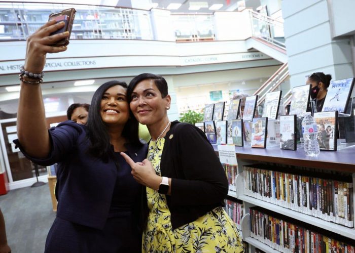 Texas state Rep. Shawn Thierry, D-Houston, takes a photo with Hala Ayala, Democratic nominee for Virginia lieutenant governor, on July 16 as they visit the Kate Waller Barrett Branch Library, the site of the 1939 Alexandria Library sit-in, where five Black men were arrested for attempting to register for a library card, in Alexandria, Va. Members of Texas House Democratic Caucus continue to lobby for voting rights reform in Washington, DC after leaving Texas to block a voting bill by denying a quorum.