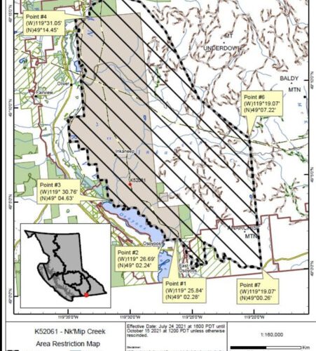 An area restriction has been put into effect for the Nk’Mip Creek Wildfire by BC Wildfire Service on Saturday evening.