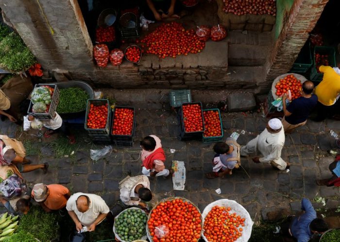 People shop at a crowded wholesale vegetable market after authorities eased coronavirus restrictions, following a drop in the coronavirus disease (COVID-19) cases, in the old quarters of Delhi, India, June 23, 2021. REUTERS/Adnan Abidi