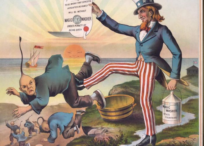 An 1880s advertisement for Magic Washer liquid washing compound, which traded on anti-Asian prejudice.