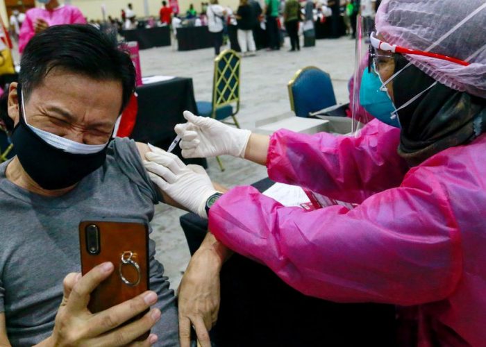 A man wearing a protective face mask reacts as he receives a dose of a vaccine against the coronavirus disease (COVID-19) during a mass vaccination program at the Jakarta Convention Center building in Jakarta, Indonesia, July 31, 2021. REUTERS/Ajeng Dinar Ulfiana
