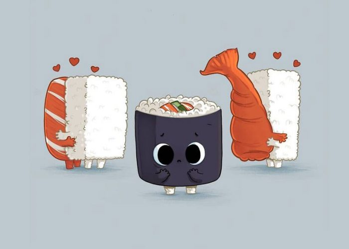The artists cute cartoon drawings personify food, nature, and other ordinary objects as he makes sure to inject some light-hearted humor into those awkward moments most of us somehow end up in regularly.
