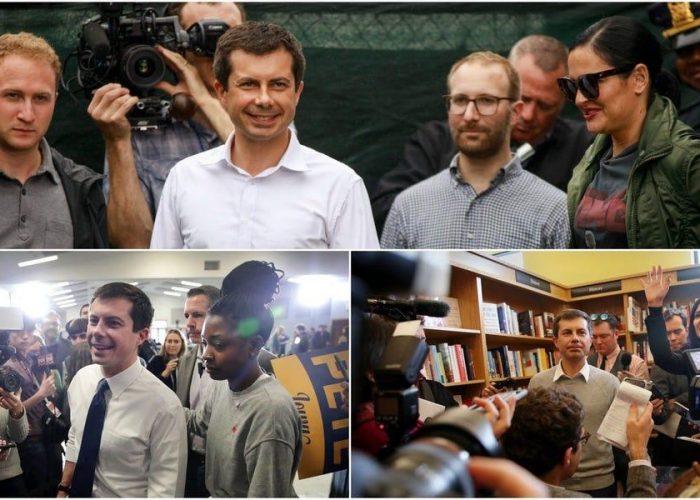 Pete Buttigieg during the 2020 presidential campaign with several of his key staffers.