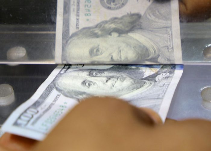 A man inserts a U.S. dollar banknote into the window of a local currency exchange in Aden, Yemen June 29, 2021. Picture taken June 29, 2021. REUTERS/Fawaz Salman