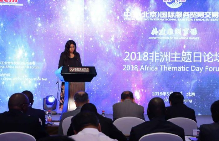 Gambian Deputy Ambassador to China delivers a speech at the African Theme Day Forum of the 2018 Beijing International Trade Fair, May 30, 2018. /VCG Photo