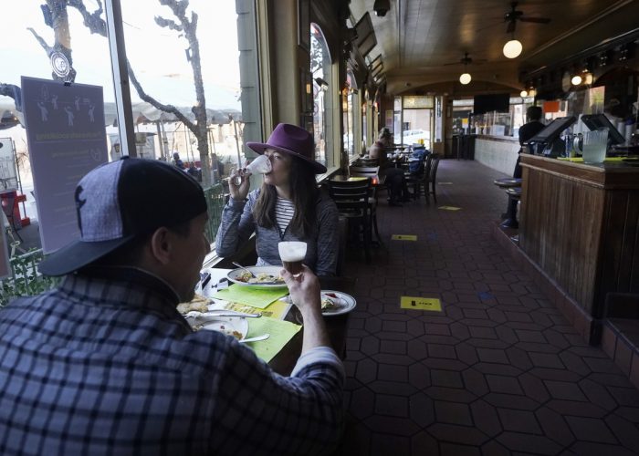 Diners eat at the Buena Vista Cafe amid the coronavirus outbreak in San Francisco in November. The city will require proof of full vaccination against COVID-19 to enter places such as restaurants.