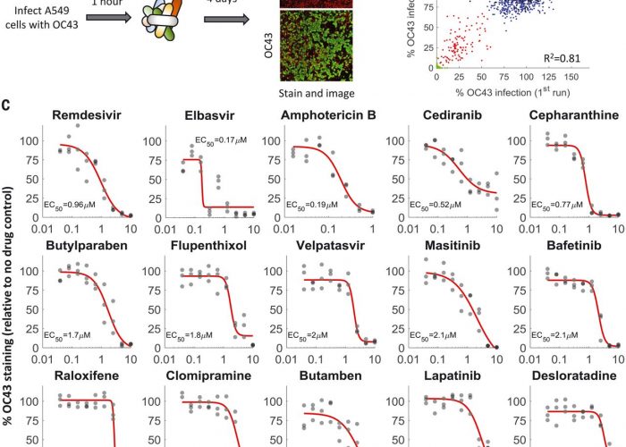 Fig. 1A drug-repurposing screen identifies multiple safe-in-human drugs that inhibit OC43 infection.(A) Schematic of the screen. A549 cells expressing H2B-mRuby were infected with OC43 (MOI 0.3), treated with drugs, incubated for 4 days at 33°C, and stained for the viral nucleoprotein. (B) Screen results showing the percentage of OC43 staining of mock-infected cells (green), no-drug controls (black), drugs with no effect on OC43 infection (blue), and screen hits (red). Overall agreement between the two repeats is high [coefficient of determination (R2) = 0.81]. (C) Dose-response curves of remdesivir and the top hits from the screen; n = 3. Individual measurements are shown as semitransparent gray circles. (Note that some circles overlap.) Additional dose-response curves are shown in fig. S1.
