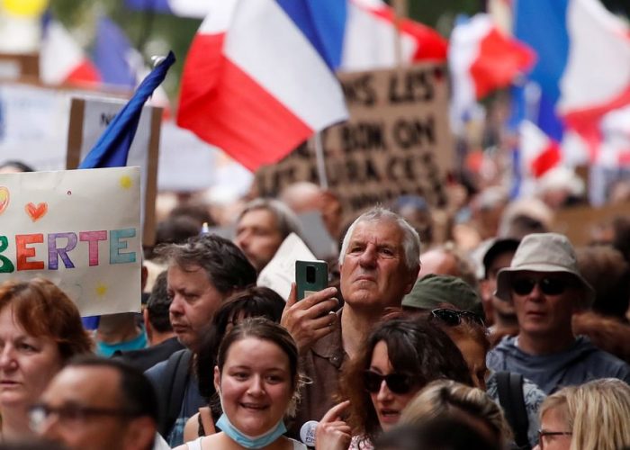 PARIS, Aug 21 (Reuters) – Thousands demonstrated across France for a sixth consecutive weekend on Saturday against a COVID-19 health pass required for daily activities, highlighting a simmering political risk for President Emmanuel Macron.