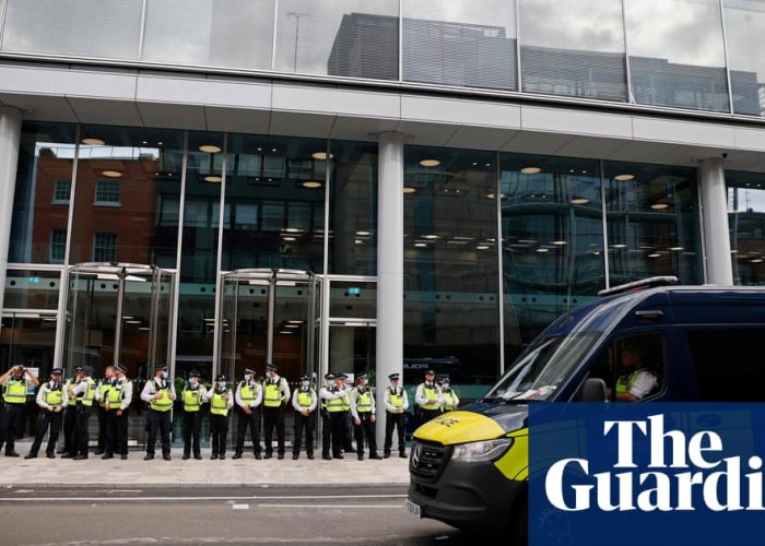 After marching from Kings Cross station to ITNs Grays Inn Road headquarters, protesters were met by two uniformed policemen guarding the buildings revolving doors. However, they were immediately let through an emergency exit by what appeared to be a supporter who was already inside the building.