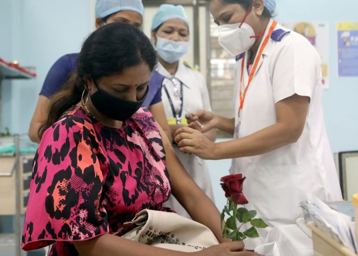 A healthcare worker holding a rose is vaccinated against COVID-19 at a medical centre in Mumbai, India, January 16, 2021. REUTERS/Francis Mascarenhas/File PhotoNEW DELHI, Aug 25 (Reuters) – India will supply millions of additional COVID-19 vaccine doses to its states to try to inoculate all school teachers by early next month, the health minister said on Wednesday, as the country gradually resumes physical classes.
