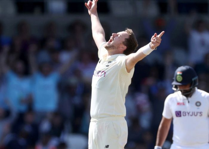 Aug 28 (Reuters) – England’s Ollie Robinson struck four times with the second new ball as the hosts thrashed India by an innings and 76 runs to level the series on day four of the third test at Headingley on Saturday.