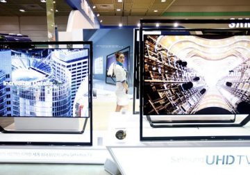 FILE PHOTO: A model stands between Samsung Electronics’ Ultra HD LCD televisions during World IT show 2013 at the Coex…