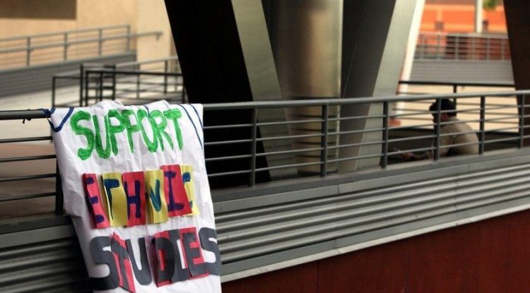 A banner hangs from an upper-floor railing as students demonstrate at Cal State L.A. in 2014 in support of ethnic studies courses. (Los Angeles Times) California State University trustees have approved a new requirement for students to take a course in ethnic studies or social justice in order to graduate.…
