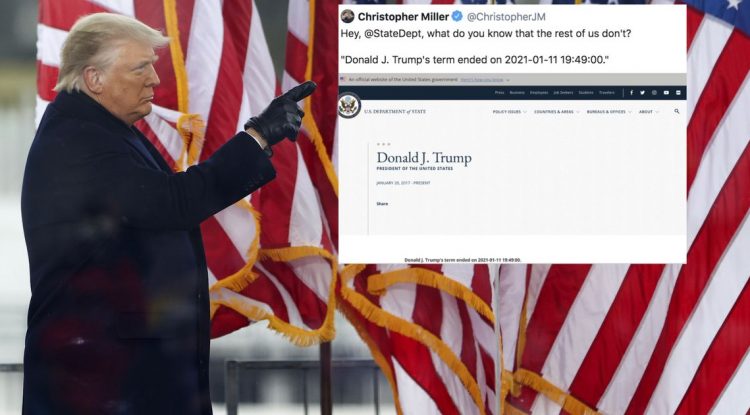 Folks online noticed something odd on Monday. President Donald Trump’s biography on the State Department website suddenly said his”term ended on 2021-01-11 19:45:20.” That’s today. Now, let’s be clear. This almost certainly doesn’t indicate Trump is going to vacate his office today. In fact, soon after people noticed the what…