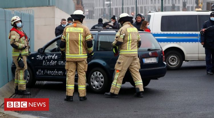 image captionMessages were daubed in white on the sides of the car A car has been driven into the gates of Angela Merkel’s Federal Chancellery building in Berlin, German police say. No casualties were reported and the background to the incident was unclear. However, the car had messages daubed in…